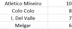 For the playoffs my guess is São Paulo, Universidad de Chile, Racing, Hurácan, Guaraní and Santa Fé.